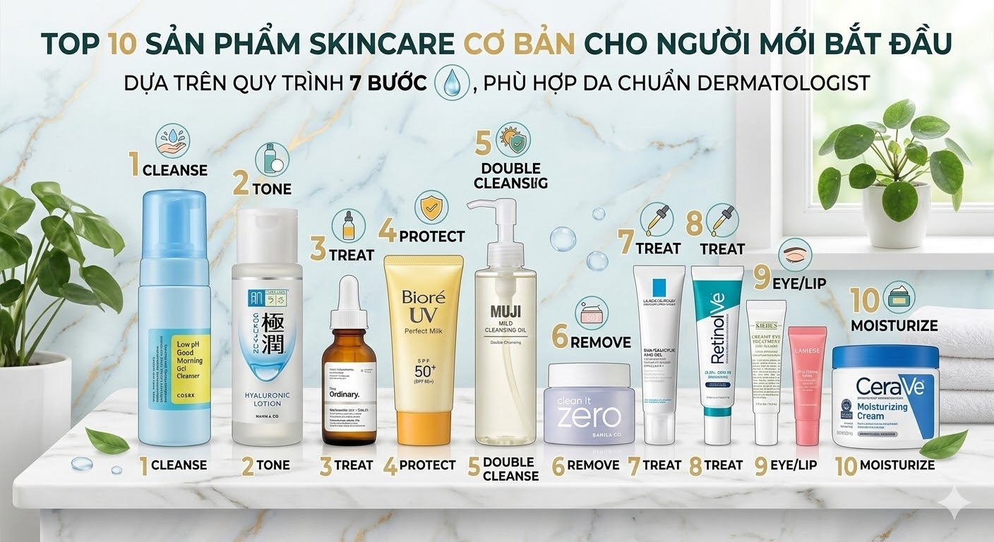 Trong bài viết này, chúng tôi sẽ giới thiệu Top 10 sản phẩm skincare cơ bản cho người mới bắt đầu, giúp bạn xây dựng routine chăm sóc da hiệu quả và khoa học ngay từ đầu.